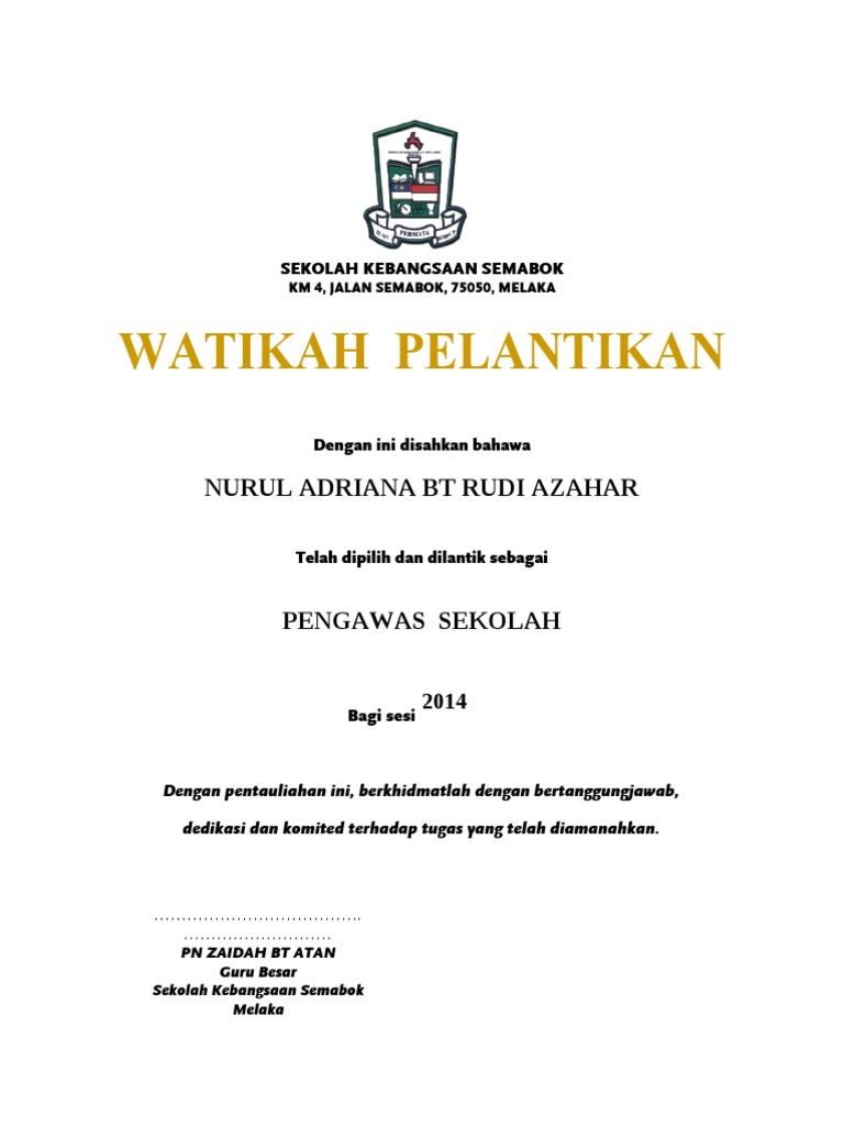 Contoh Sijil Watikah Pelantikan Pengawas Zahilkuy. Telah dilantik sebagai ahli pembimbing rakan sebaya sma al madrasah al. Watikah Perlantikan Pegawas Sekolah dan Pengawas Perpustakaan telah diadakan pada hari Ahad 06 Januari 2011.
